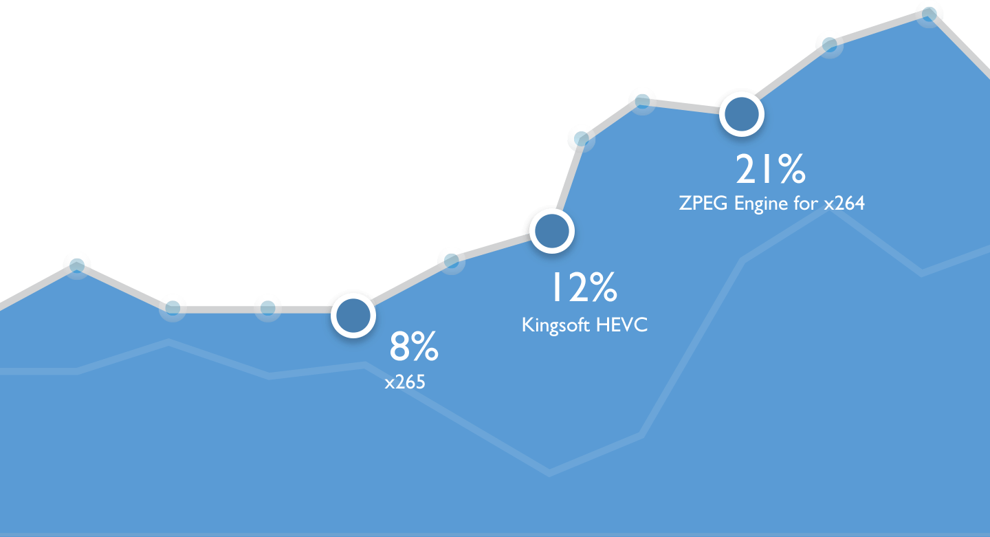 Perhaps 80% of all video bandwidth is compressed using x264. If that number includes you, you’re getting pretty good compression. But you’re still paying too much for video storage, and for streaming bandwidth! Why not save 21% of your video management costs by upgrading to ZPEG Engine for x264? Apply a seamless binary upgrade, and you start putting saving in your pocket from day 1!